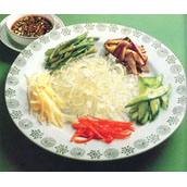 아홉개의 칸으로 갈라진 구절판이라는 료리그릇에 고기와 남새로 여러가지 나물을 만들어 밀지짐과 함께 담아내는 료리이다.
