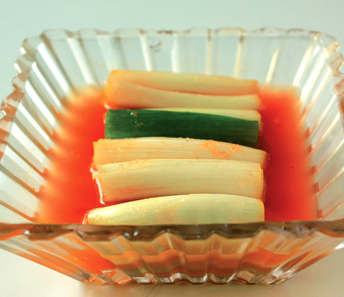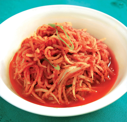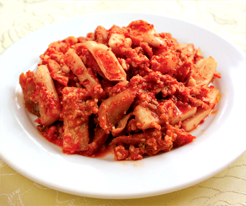 - 4. 채친 무우에 고추가루갠것을 먼저 두고 버무린 다음 양념한 새우젓, 미나리줄기, 채친 파, 다진 마늘과 생강즙, 100g의 가루소금을 두고 고루 섞어 소를 만든다. 기호에 따라 단맛감을 더 넣을수 있다.