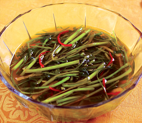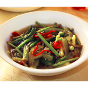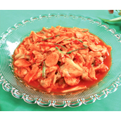 - 3. 사과, 배는 쪽으로 썬다. 파는 깨끗이 다듬어 씻은 다음 3~4cm길이의 토막으로 썰고 마늘은 다지고 생강은 즙을 낸다. 청각은 물에 불구어 비벼서 모래를 말끔히 없앤다. 고추가루는 하루전에 따뜻한 물에 개여놓는다. 새우젓은 잘게 다져서 고추가루와 다진 마늘을 넣고 고루 비벼놓고 미나리줄기는 4~5cm길이로 썬다.